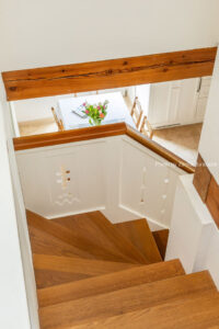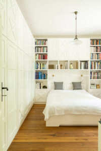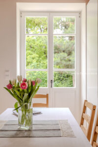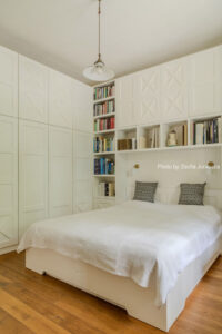 A ház eredeti homlokzati szépségét régi fotók és aprólékos kézműves munka segítségével állították helyre. Belül a terek átgondoltan szervezettek: egyedileg készült bútorok, letisztult anyaghasználat és harmonikus színvilág teremtik meg a tágasság érzetét, még egy kisebb alapterületen is.
