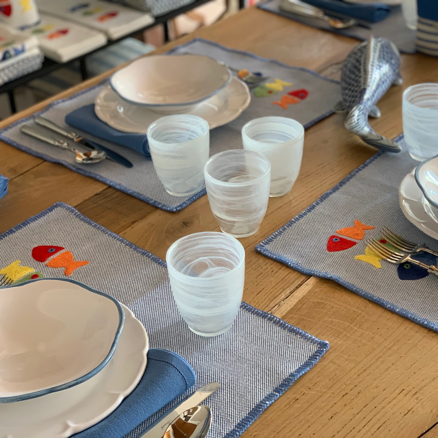 This sky blue embroidered Busatti placemat is crafted from Busatti’s Antico Casentino fabric, a distinctive triple-twisted linen weave. Featuring cheerful fish embroidery, it adds a touch of playfulness to the table while offering sophisticated charm that suits both modern and classical interiors.