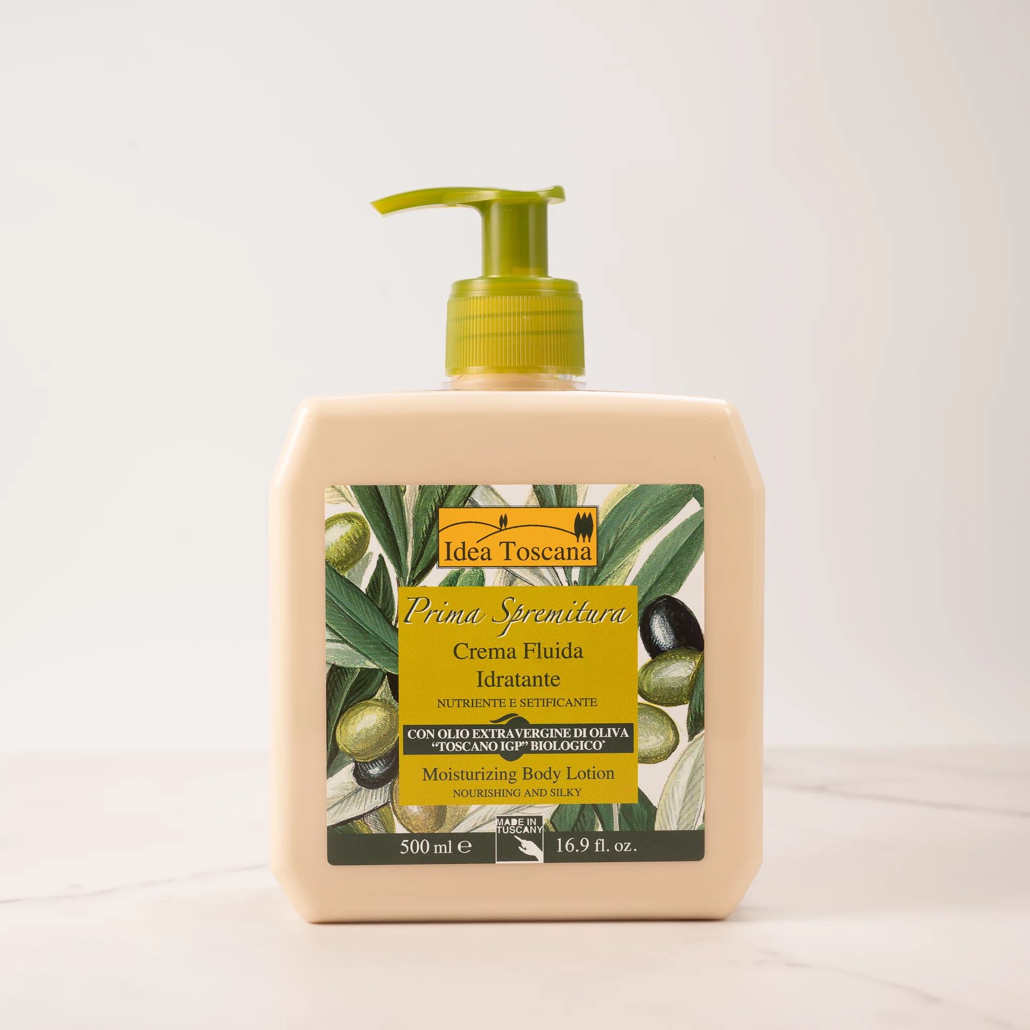 The Idea Toscana moisturizing body lotion in this generous 500 ml format is a luxurious, plant-based formula enriched with certified organic extra virgin Tuscan olive oil (Toscano PGI), shea butter, and glycerin. These natural ingredients deeply hydrate, soften and restore the skin’s hydrolipid balance, making the skin visibly healthier, more elastic and radiant.